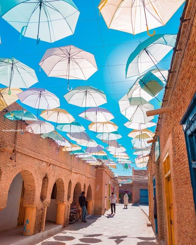 Commercial streets, too, can’t be more.. genuine! Atop the earthy, resilient fine brick walls, hold and blend a set of pastel umbrellas arranged by the dreamful youth of Nefta, artwork immortalized by Amine Mouelhi in southwestern Tunisia.. Enjoy your way!