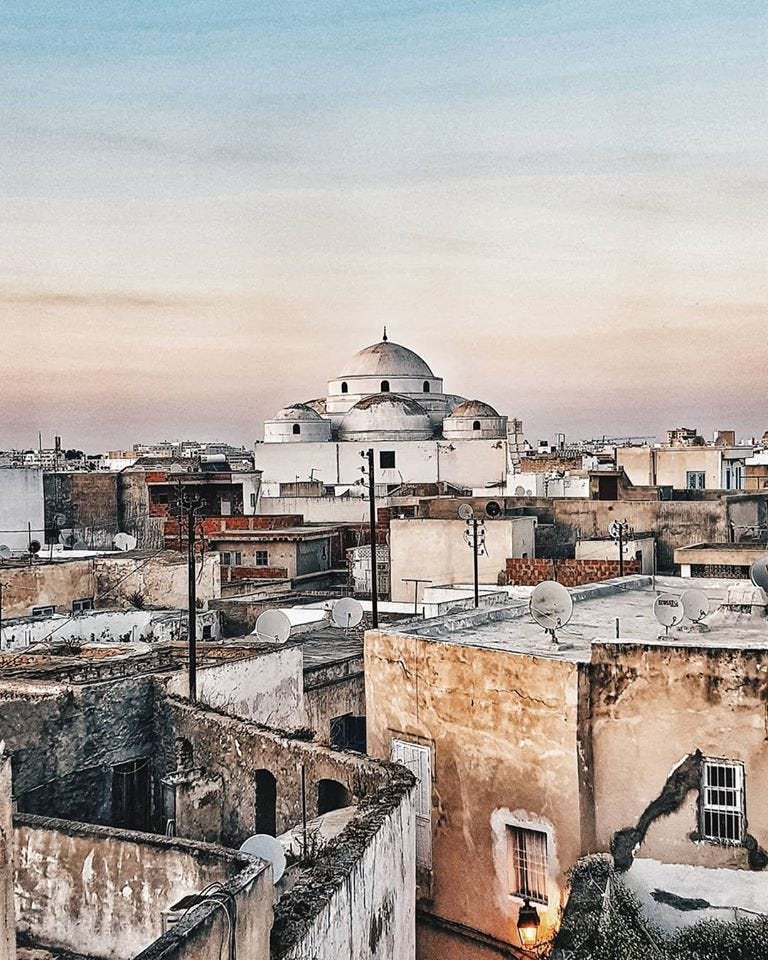 Magical wander across the millenary rooftops of Kairouan amid contrasts of shapes, shades, and ages beneath a dramatic sky, painted through the lens of Seif Cherif