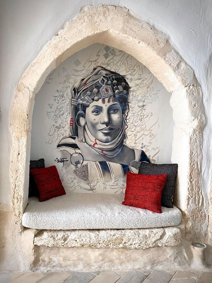 To the next dreamland: Djerba island, taking solace in the comfort of El Fondouk in such a pristine room, graced by this mural of a graceful, composed woman from Tunisia, immortalized by its youth. Painting & Photo credits unknown.