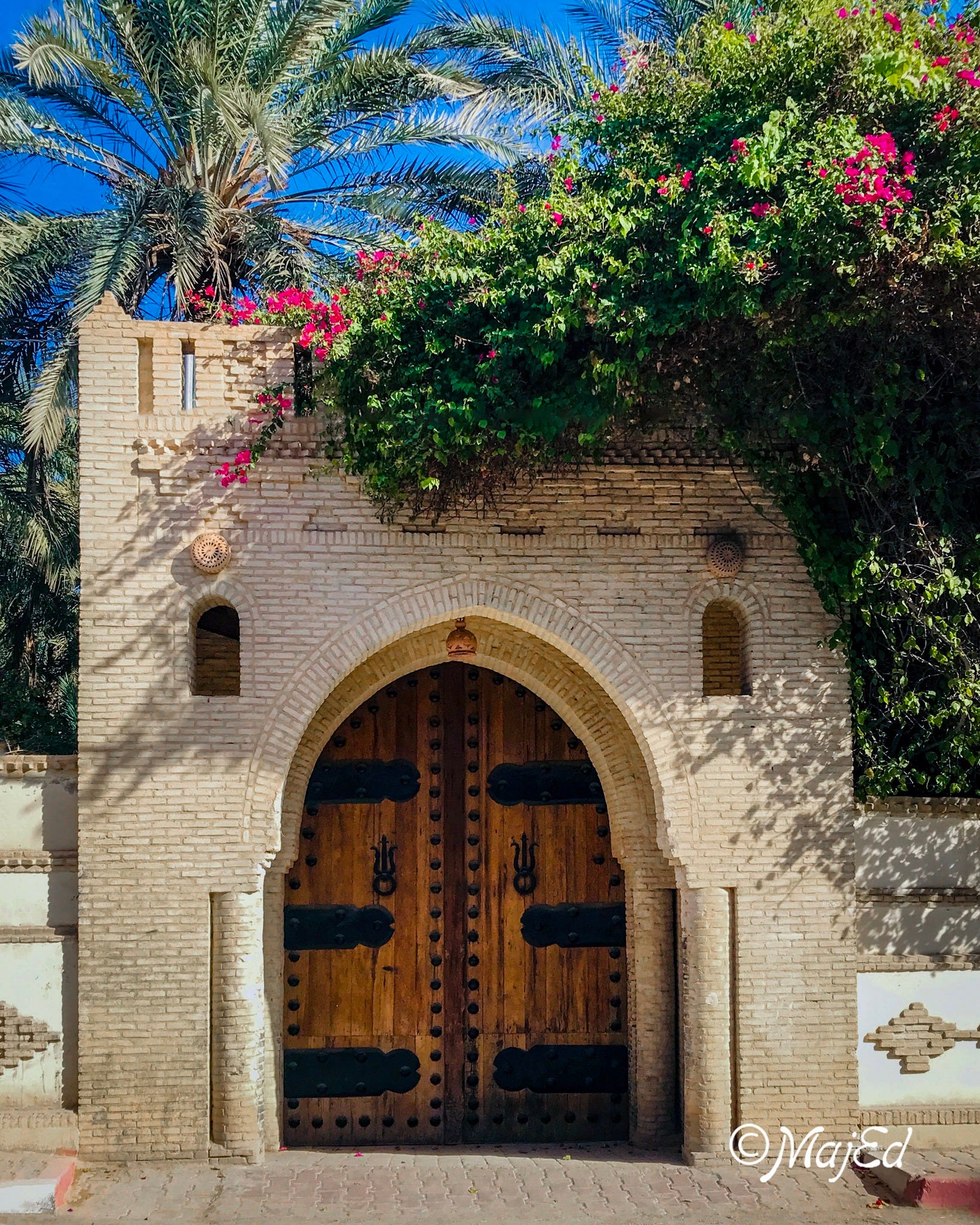 To the city and solace next door: Tozeur, here we stumble upon a refined yet authentic brick facade and door, caressed by Tunisia's emblematic bougainvillea, relished and captured by Majed Sahli