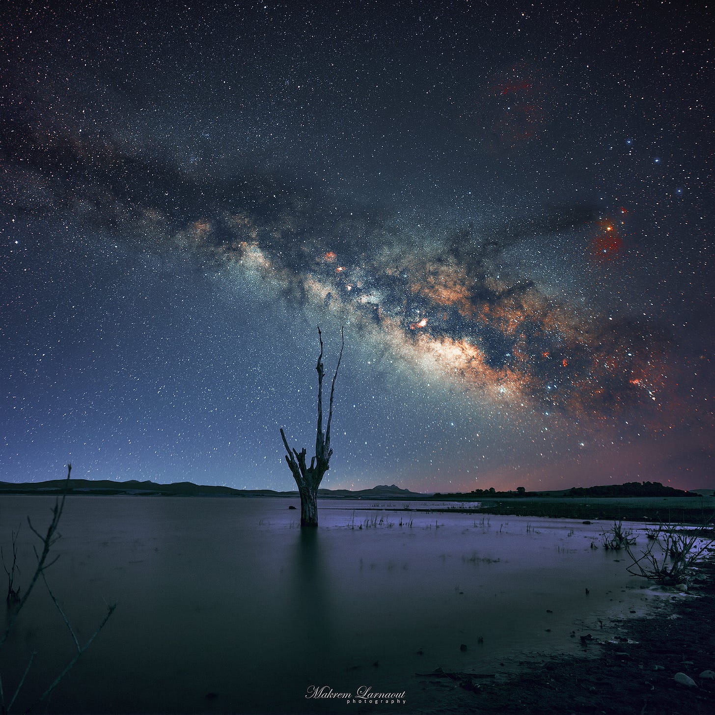 Next tableau: The Celestial River - our Milky Way - flowing over the tranquil waters of Oued Zarga, northwestern Tunisia, embraced and pictured by Makrem Larnaout
