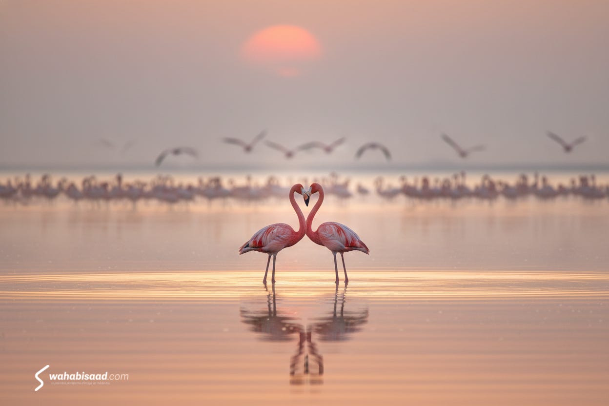 After the lonely, content bird, here is a couple of flamingos entwined in love, blended with a sunset painting through the lens of Saad Wahabi in the vast expanse of Tunisia’s southeastern islets and lagoons: Boughrara in the vicinity of Medenine