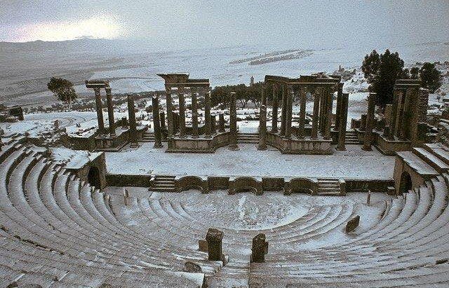 Another setting draped in white, contemplated from the timeless seats of Thugga, modern-day Dougga, ancient cosmopolitan metropolis revived by the festive pulse of Tunisia’s summers.. Photo credit nknown